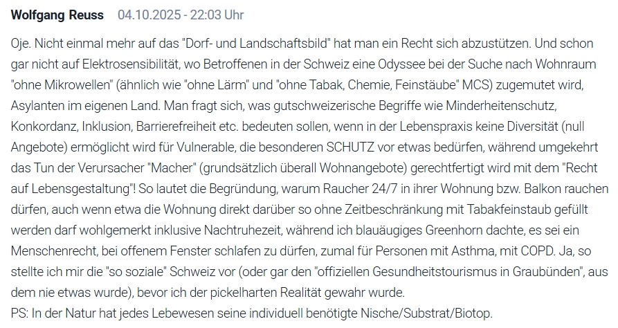 Betreffend Wohnen 1) Luft (Tabakrauch, Chemikalien etc. bis zu 24/7 man "jederzeit" damit rechnen muss ist keine Lebensqualität, insbesondere für Atemwegekranke wie Asthma, COPD, Corona-Lungenverletzte) und 2) Lärm (primär indoor, auch outdoor) frage ich: WO dürfen Vulnerable (wie Dauerkopfschmerzen, ZNS/Trauma, MECFS/LongCovid, Herz/Kreislauf etc.) wohnen in Frieden (zwecks Chance Aufrechterhaltung oder gar Aufpäppelung) bzw. warum sehe ich in der Schweiz Behinderung (Behindertengleichstellungsgesetz, Inklusion, Barrierefreiheit) ausschliesslich gleichgesetzt mit Rollstuhl (Beweglichkeit; Beispiel Dusche statt Badewanne, was wiederum andere Behinderte benachteiligt), aber nicht mit Reizen (Immissionen als Barriere), so wie das der KSC (Kantonsspital Chur) -Arzt Gregory Fretz thematisiert im SRF-Kassensturz 3.12.2024: