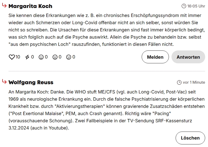 Long-Covid dürfte etwa dasselbe wie ME/CFS sein, und das ist seit 1969 von der WHO als neurologische Erkrankung anerkannt. Auch von Krankenkassen und Invalidenversicherung in der Schweiz?